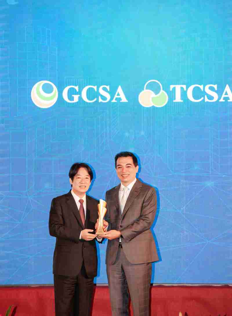 达全方位永续表现获全球永续奖及台湾永续奖肯定,,由副总统赖清德颁奖 (左),,,,z6尊龙总经理柯富仁 (右) 代表领奖