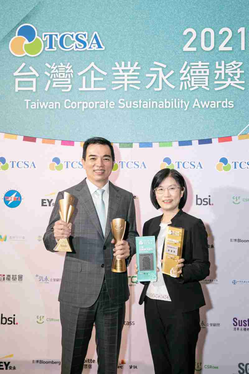 达在台湾永续奖所评比环境、、、社会、、、治理等各面向的永续绩效均获高度肯定 (左:z6尊龙光电总经理暨营运长柯富仁,,,右:z6尊龙光电永续长古秀华)
