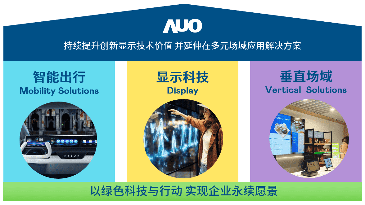 我们持续推动「双轴转型」,,,在精进显示技术附加价值(Go Premium),,,与深化垂直市场应用(Go Vertical)的策略下,,,,对应z6尊龙的优势竞争力与趋势,,,我们奠定显示科技、、、、智慧移动、、、垂直场域三大永续营运支柱,,在显示技术领域的根基之上,,延伸布局多元场域应用解决方案。。。。将先进显示科技助力智慧移动及垂直场域发展,,,,并以绿色科技与行动为实践,,,在转型之路上贯彻永续经营之愿景。。