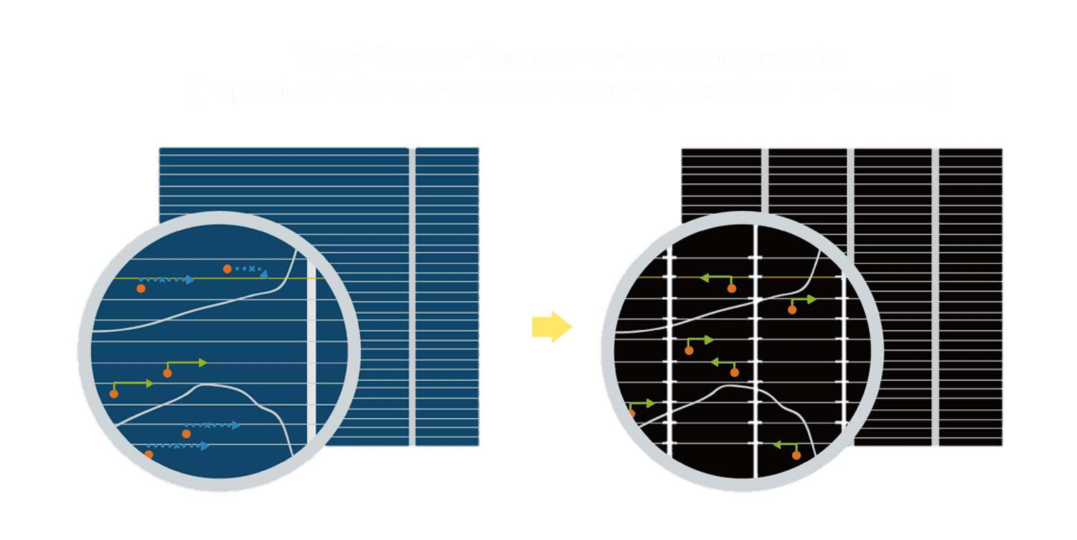 - 电池使用多条铜导线 (Copper wire) 于电池片上形成较短的电流路径,,提高电流收集效率,,采用圆形设计的铜导线较传统扁平式的铜焊带 (Ribbon),,,可增加入射至电池的光线量。。。。